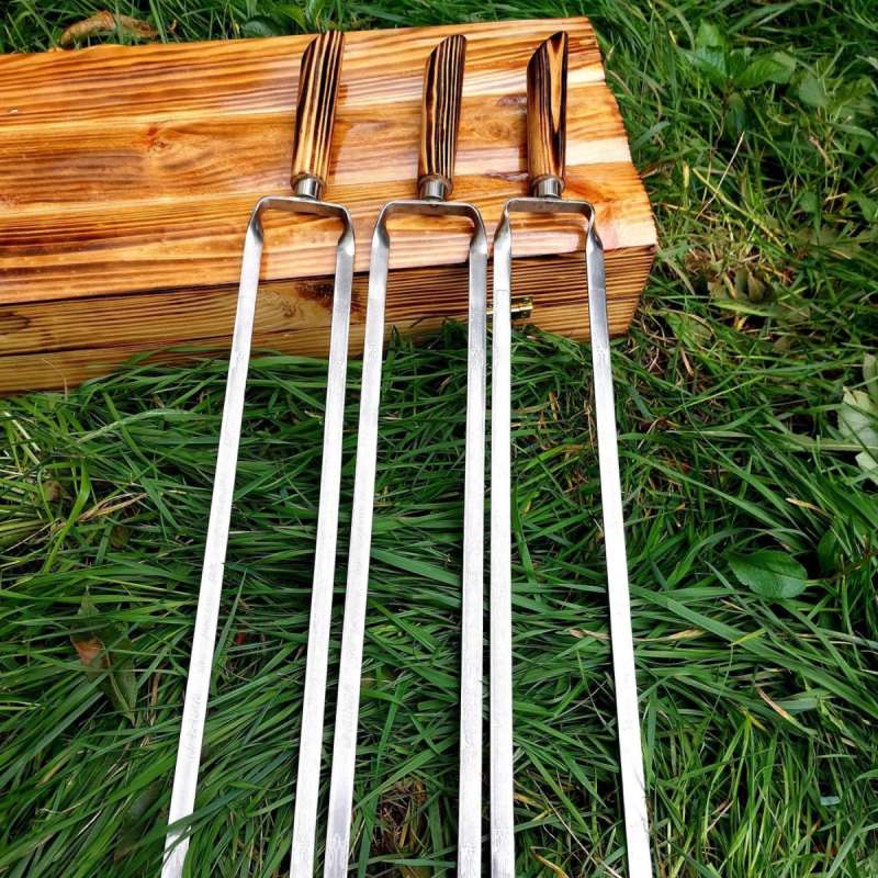 А ручка виготовлена з дерева та покрита подвійним шаром лаку, що надає їй елегантний вигляд і зручність у використанні. Завдяки дерев'яній ручці, ви зможете безпечно маніпулювати шампуром навіть під час гарячого грилю.