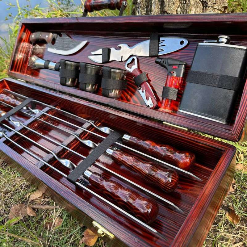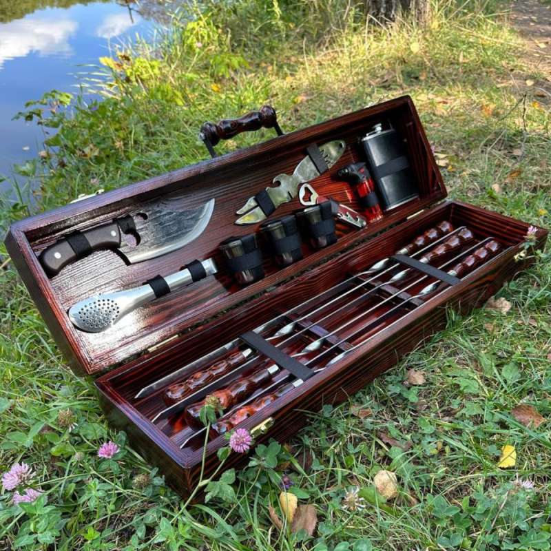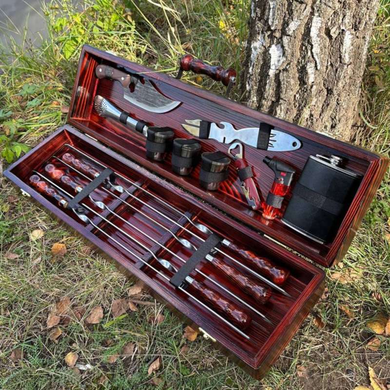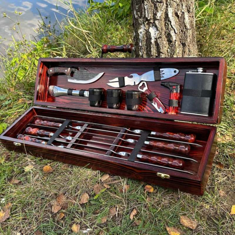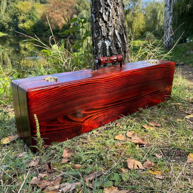 Дерв'яний кейс червоного окрасу, який гарно переливається на сонці. До якого входить: